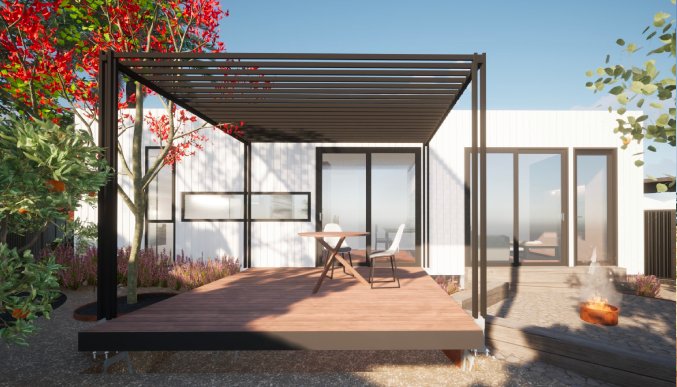 A modern three-bedroom, two-bathroom modular home designed for comfort and durability, featuring premium glazing, built-in cabinetry and refined finishes.